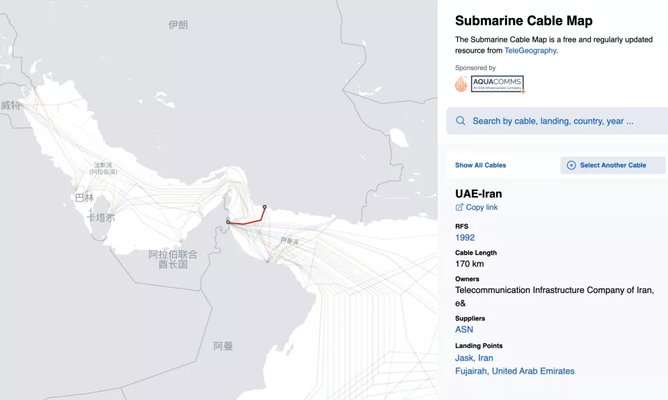海底光缆在波斯湾的“汇聚点”:“TeleGeography 海底光缆地图显示,阿联酋富查伊拉(Fujairah)与伊朗贾斯克(Jask)之间的 UAE–Iran 海缆只是其中一段,周边密集的光缆走廊把中东连接到欧洲与亚洲的主干网络;一旦该区域出现地缘冲突或基础设施扰动,全球数据链路的脆弱性会被放大。”