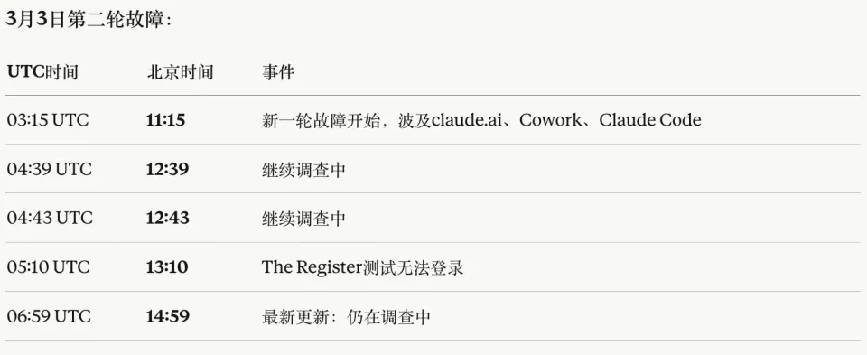 而仅仅几个小时后的UTC 3月3日凌晨3:15(北京时间11:15),新一轮故障再次出现,影响范围扩展到了Claude Code和Cowork,截至发稿时问题仍在调查中。