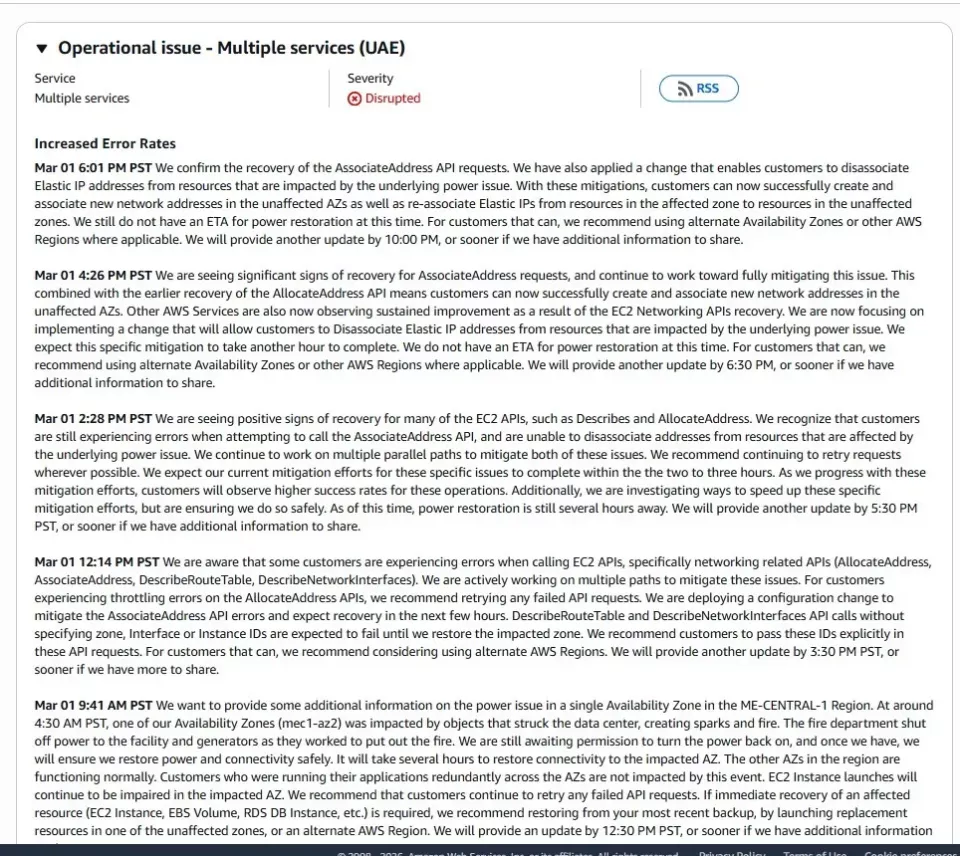 AWS 官方状态页的事故通告:阿联酋(UAE)区域(ME-CENTRAL-1)某个可用区因供电事故(数据中心被异物击中引发火花/起火,消防切断电力)导致多项服务与 EC2 网络相关 API 错误率升高、服务受影响。