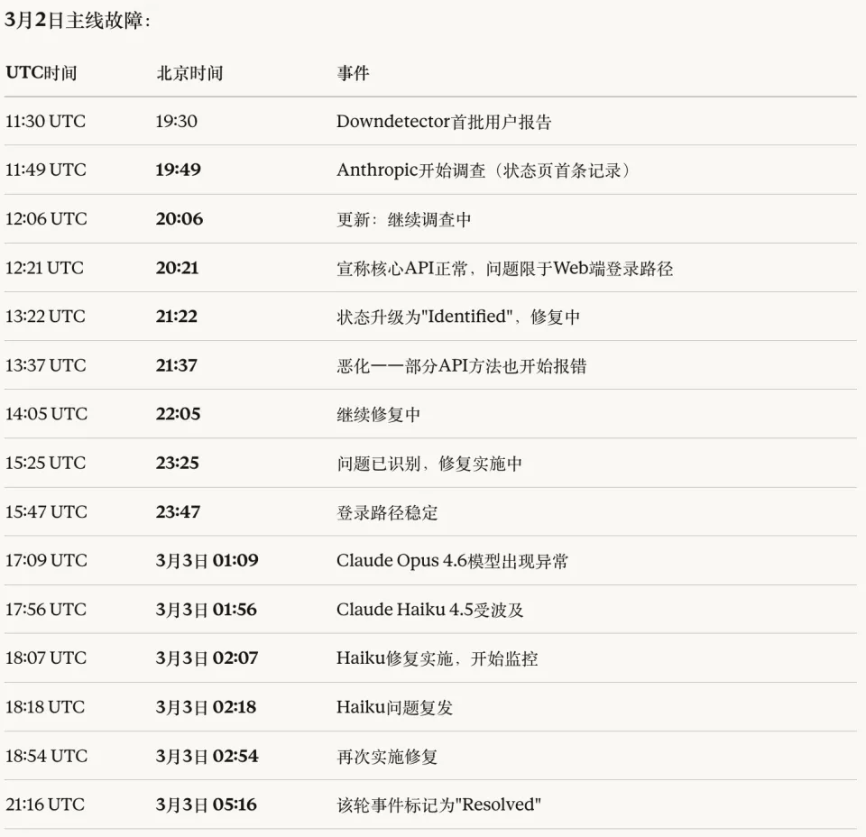 直到UTC 15:47(北京时间23:47)左右,主要服务才逐步恢复。随后 Opus 4.6 又出现多次短时 elevated errors(含一段延续到约 21:16 UTC ,北京时间3月3日5:16)。
