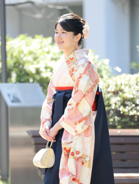 她那天穿了一袭桃花色的振袖和服,粉白格纹打底,上面印着精致的花朵图案,长发挽起,走在父母身后,拎着一只方形手包。没有夸张的首饰,没有浓艳的妆容,但就是那种端庄里透出来的温柔,让人挪不开眼。