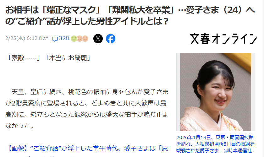 据学习院相关人士透露,爱子上大学时,曾有朋友想牵线,把一位同龄的杰尼斯男艺人介绍给她认识。