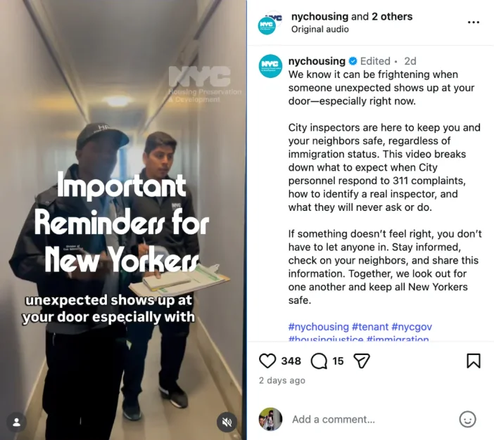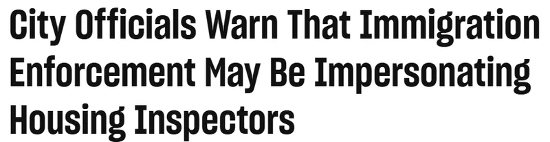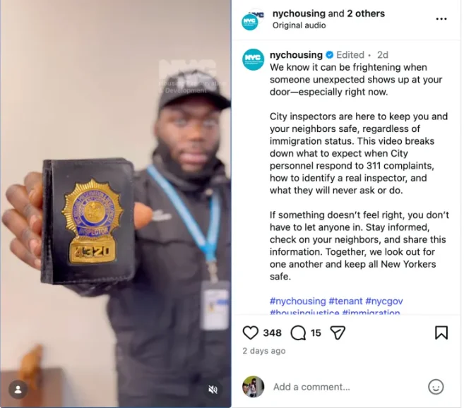 住房官员提醒纽约人,在“移民执法力度加大”的背景下,如何分辨真正的市政府检查员与可能冒充者。此提醒来自该机构近期发布的一段类似公益广告的视频。