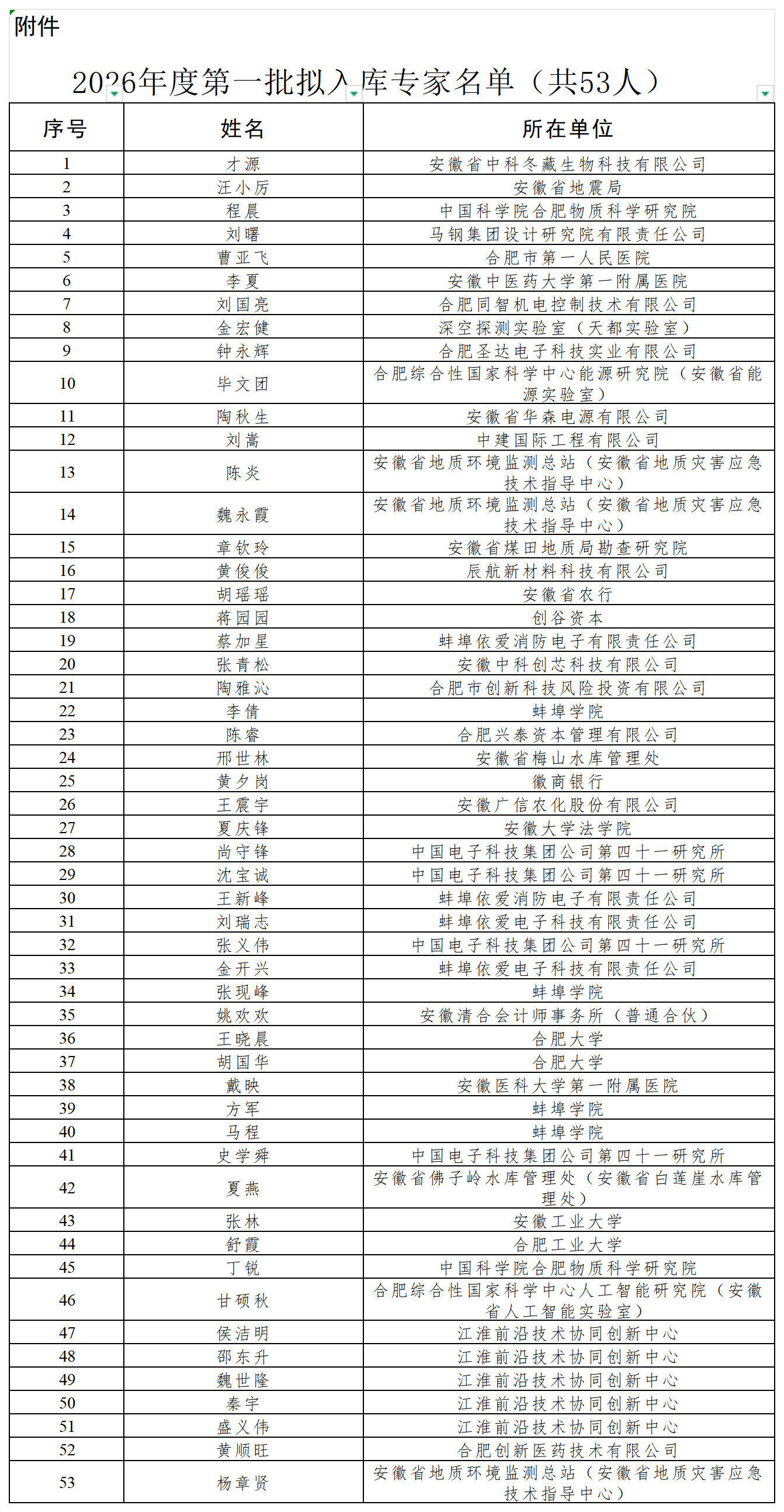 为进一步充实省科技专家库专家队伍,根据《安徽省科技专家库管理及使用办法》(皖科资〔2025〕7号),省科技厅对申请入库专家的材料进行了认真审核,现将2026年度第一批拟入库的53位科技评审专家名单予以公示。