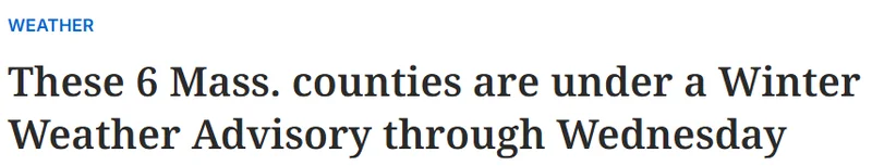 美国国家气象局(NWS)周一针对麻州六县发布了冬季天气预警(winter weather advisory),提醒居民做好应对危险路面状况的准备,相关路况可能会扰乱通勤,影响持续至周三上午。