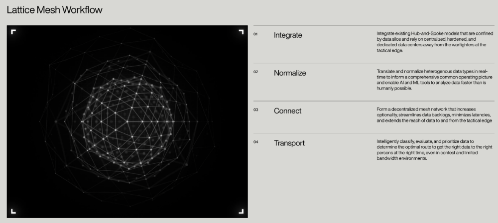 认知层:Anduril 的 Lattice Mesh 战场感知网络承担核心处理功能,通过 “整合 - 标准化 - 连接 - 传输” 四步 workflow,实时汇聚异构数据并标准化处理,即便在对抗性电磁环境与低带宽场景下,也能将数据高效传输至战术前沿;随后数据进入 Palantir AIP 平台,Claude 大模型将结构化数据转化为语义化输出,指挥官可通过自然语言直接交互,大幅降低使用门槛;