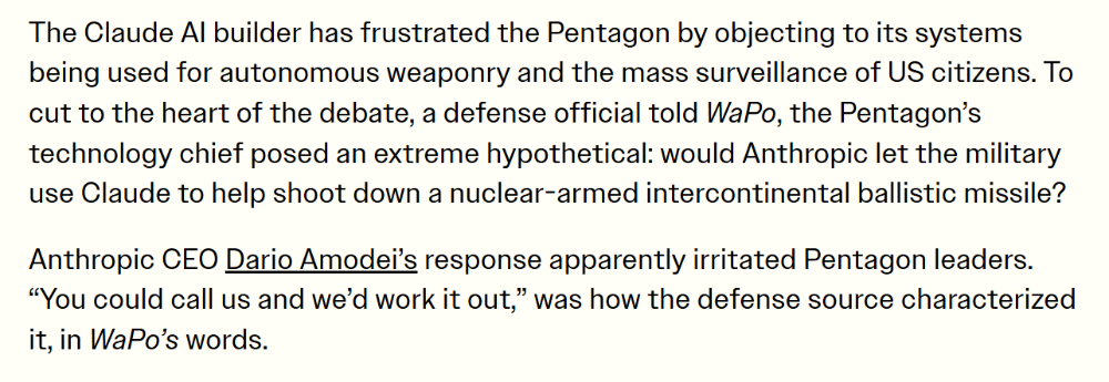 更具争议的一幕发生在一场极端假设的对话中:五角大楼官员询问,若需拦截携带核弹头的洲际弹道导弹,Anthropic 是否会授权使用 Claude?达里奥的回应是 “你们可以打电话给我们,我们一起想办法”,这一答案彻底激怒了军方领导层。