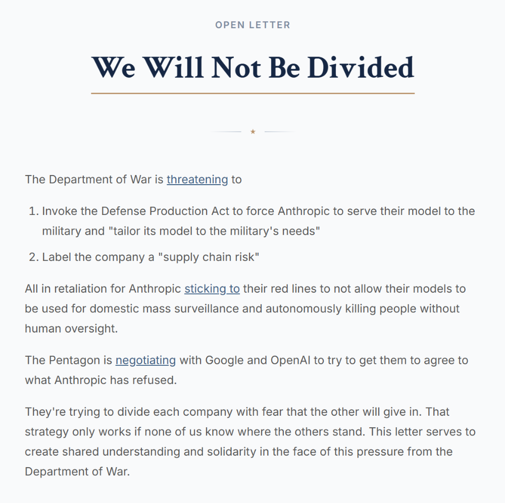 这一决策引发行业强烈反弹,800 多名谷歌与 OpenAI 员工联署《我们不应被分裂》(We Will Not Be Divided)公开信,批评管理层妥协。有意思的是,埃隆・马斯克的 xAI 同期与五角大楼签署协议,允许 Grok 模型用于机密军事系统,却未引发同等规模的舆论风暴。