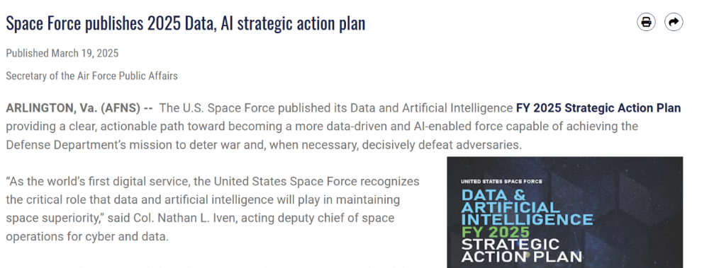 感知层:由美国太空军主导,依托地球同步太空态势感知计划(GSSAP)卫星星座、地基光学传感器系统(GBOSS)与深空高级雷达能力(DARC),实现全球地面与轨道目标持续监视。太空军 2024-2025 年连续发布 “数据人工智能战略行动计划”,将 AI 纳入全军数据战略,明确提升人员 AI 素养、测试大模型军事应用、强化数据互操作性等目标;