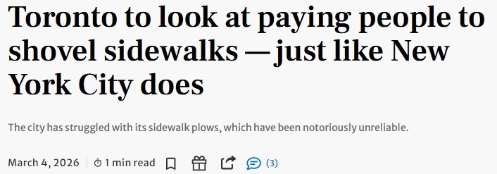当明年冬天城市人行道再次堆满积雪时,多伦多居民看到的也许不再只是无奈,而是赚钱的机会。由于市政府在人行道清雪方面一直面临效率问题,市长邹至蕙(Olivia Chow)正要求市府尽快研究一项“付费铲雪”计划,借鉴纽约市的成功模式,并争取最迟在下一个冬季实施。 邹至蕙在3月3日写给市政府执行委员会的一封信中表示:“人行道清雪一直是市民抱怨的一个问题。”这封信预计将在下周列入会议议程。