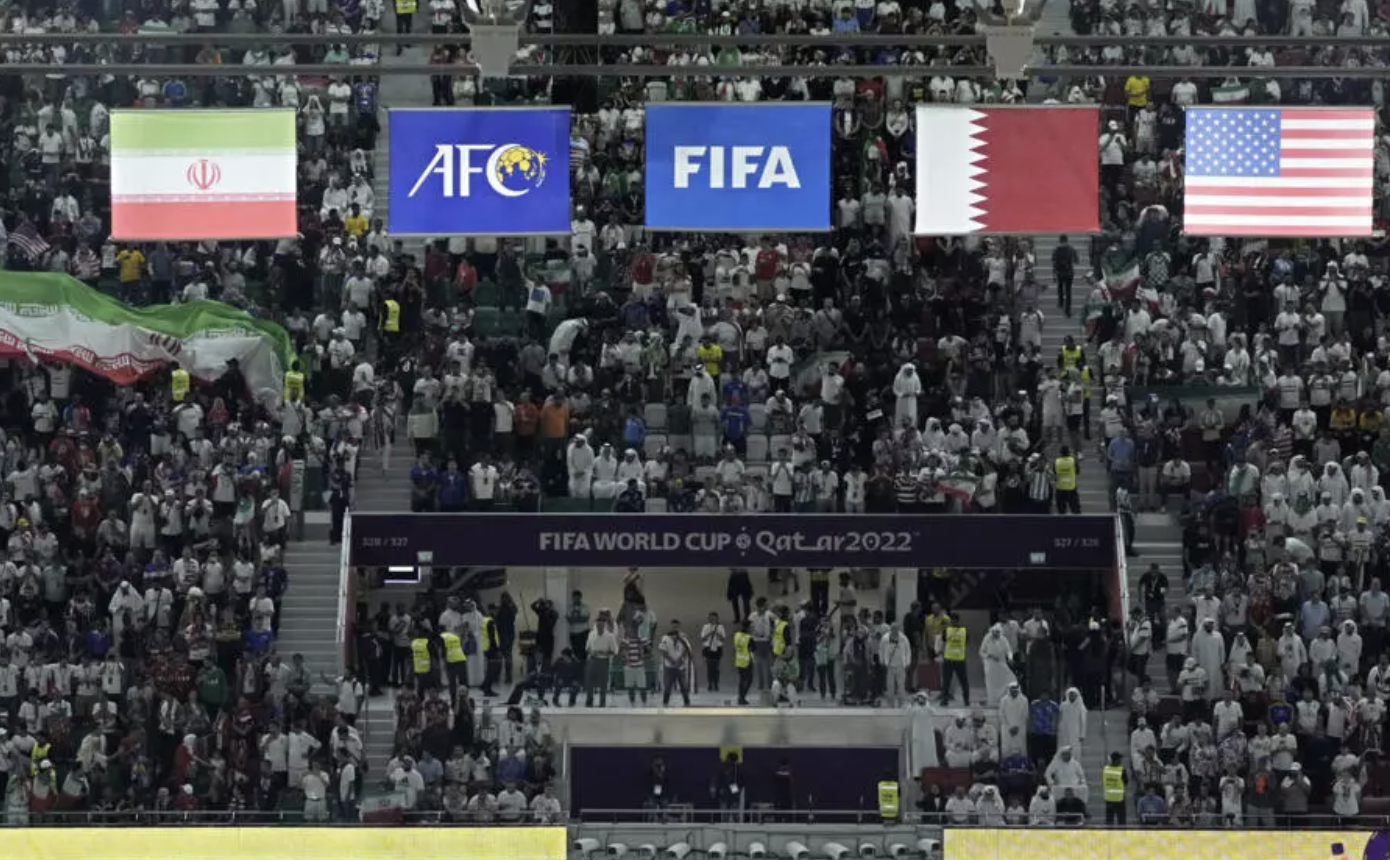 2022年11月29日,卡塔尔足球世界杯赛场上的伊朗和美国国旗并肩摆放 AP - Hassan Ammar