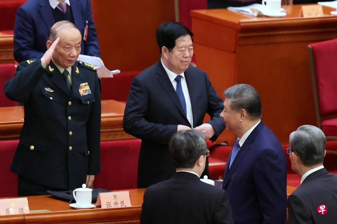 中国国家主席习近平(前排右二)星期三(3月4日)在北京人民大会堂出席中国全国政协开幕会。习近平在步出会场时,坐在其后排的中央军委副主席张升民用敬礼的方式跟他打招呼。 (路透社)