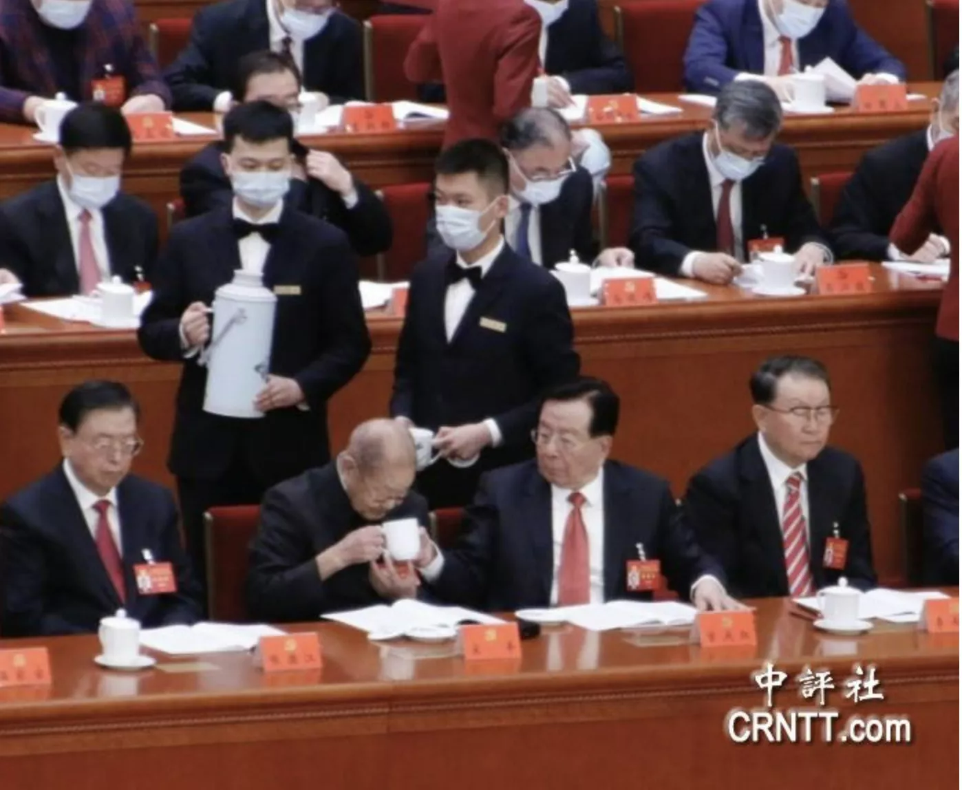 10月16日,北京,105岁前中共政治局常委宋平出席二十大,他饮茶时前国家副主席曾庆红伸手扶稳茶杯。(资料图片)