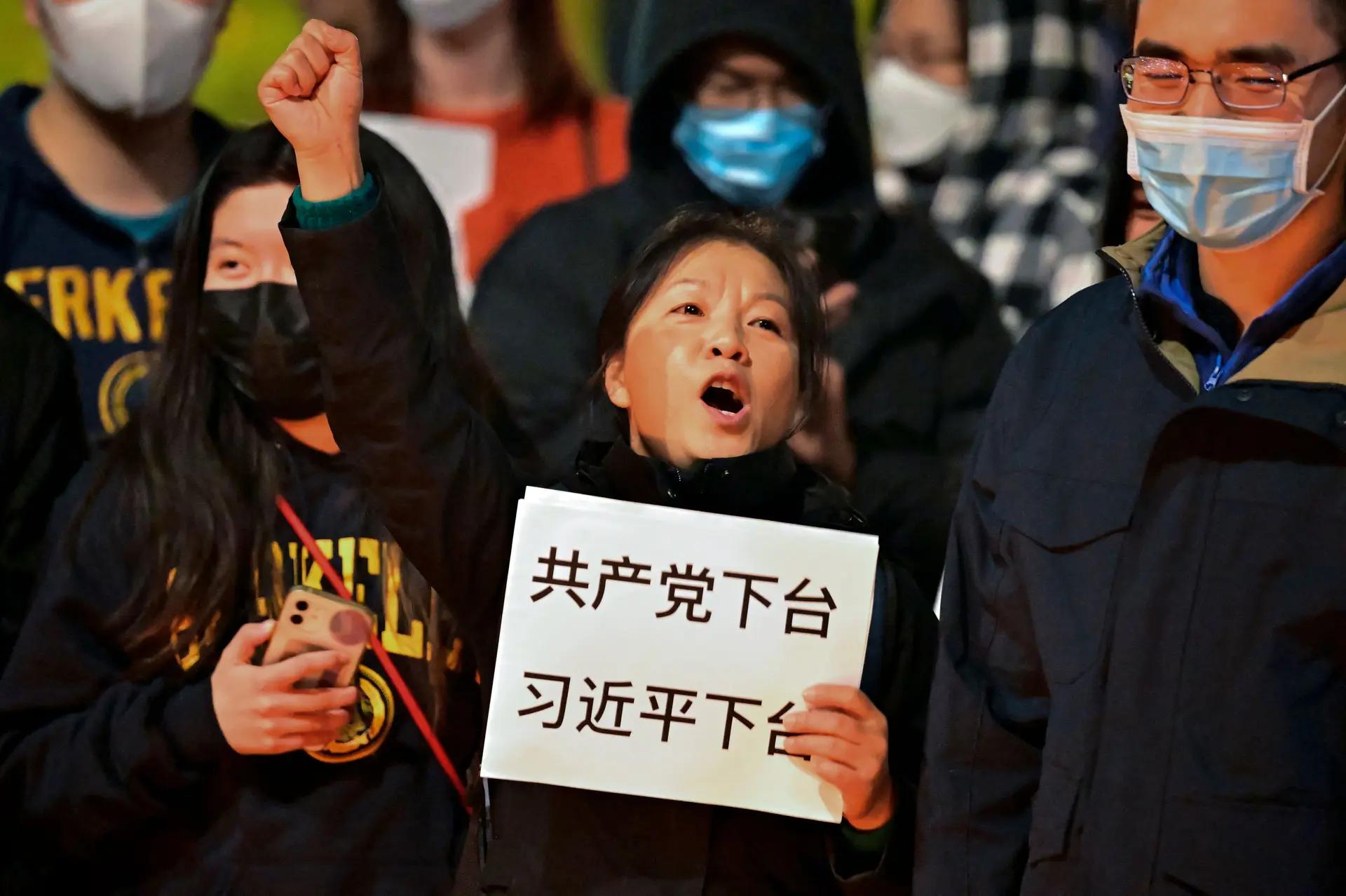 资料照片:2022年11月28日,加利福尼亚大学校园内,华人拿着“共产党下台”的标语集会。(Josh Edelson/AFP via Getty Images)