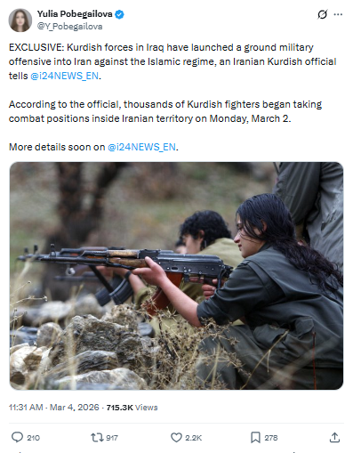伊朗库尔德政治力量联盟(CPFIK)一名官员周三(3月4日)对i24NEWS表示,驻伊拉克境内的库尔德武装力量已开始对伊朗政权部队发起地面军事行动,并称相关行动从3月2日午夜起已经启动。