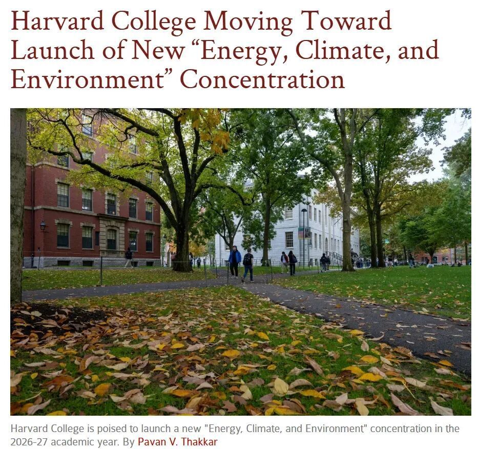 就在WashU官宣新专业后不久,哈佛大学也宣布将在2026-2027学年推出全新本科专业能源、气候与环境(Energy, Climate, and Environment,简称ENCE)。