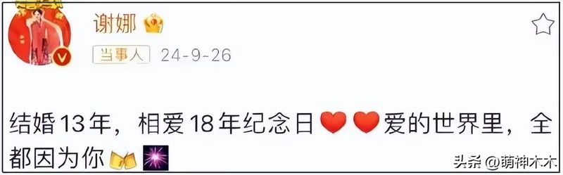 先来看谢娜对这段感情的定义,2024年9月26日,谢娜发文写下“结婚13年,相爱18年纪念日。”