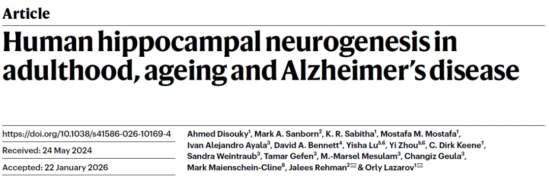 [1] Disouky, A., Sanborn, M.A., Sabitha, K.R. et al. Human hippocampal neurogenesis in adulthood, ageing and Alzheimer’s disease. Nature (2026). https://doi.org/10.1038/s41586-026-10169-4