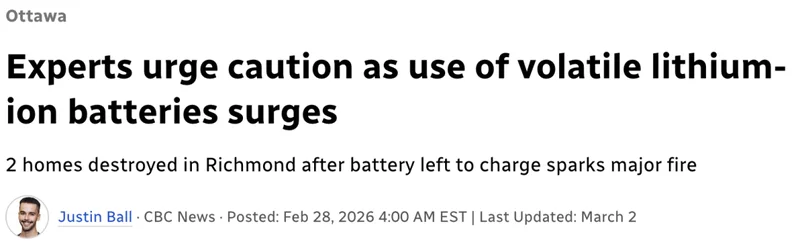 近期,加拿大多起由锂离子电池引发的火灾接连发生,引发消防部门高度警惕。