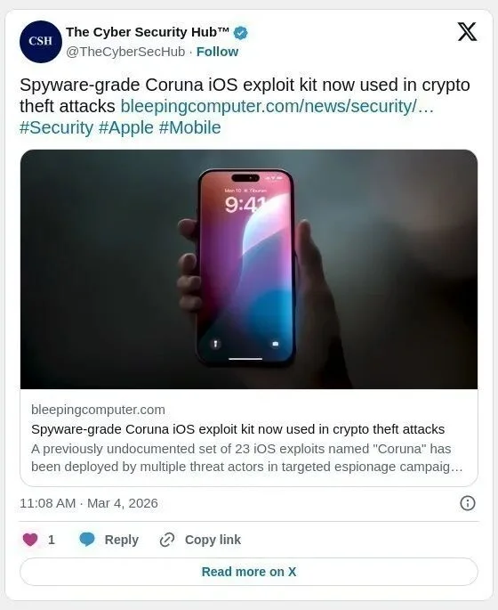 安全公司iVerify指出,“Coruna”可能起源于美国政府的高级监控工具,随后泄露或被出售,最终落入多个黑客组织手中,用于大规模网络犯罪。
