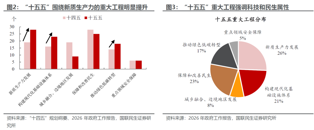 二是重大工程的布局变化,同样映射出“质”的分量。对比“十四五”,“十五五”重大工程清单中,围绕新产业新赛道培育、前沿科技攻关等领域的新质生产力工程占比显著提升,成为“提质增效”的硬核支撑。