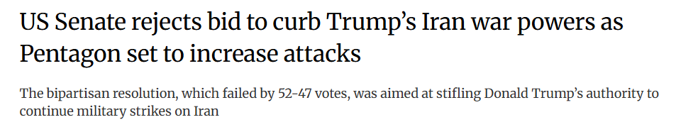据报道,共和党控制的参议院以52比47的程序性投票结果,阻止了这项旨在限制川普战争权力的决议,从而阻止了该决议提交参议院进行辩论。