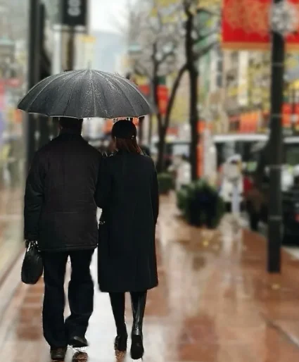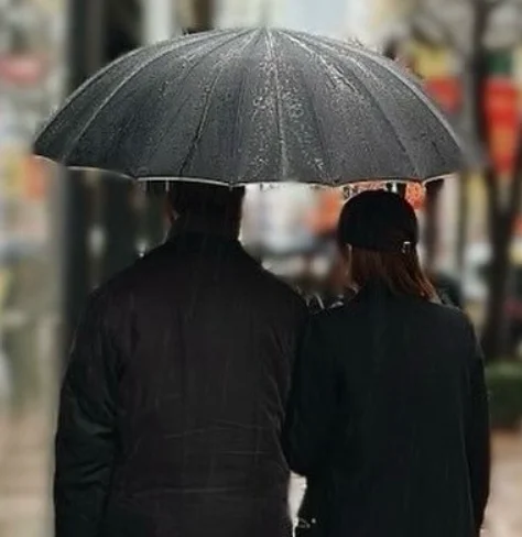 下雨天,银座街头,一男一女撑着伞并肩走。女生挽着男生的手臂,两个人步伐一致,全是黑色系穿搭,氛围感拉满。照片糊糊的,像狗仔偷拍的角度,但偏偏拍出了日剧质感。