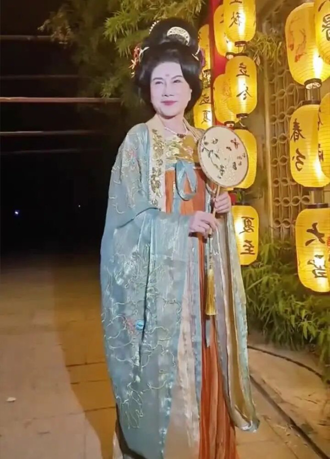 橘色的温暖与金色的华丽相互映衬,勾勒出她优雅的身姿,一点也不像年近七旬的老人。