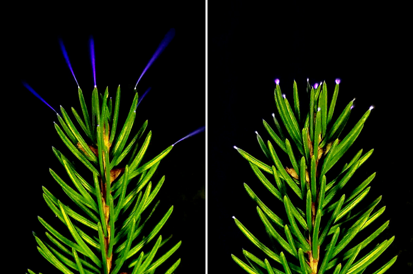雷雨天气中,树针尖端的电场会产生电晕,或者说是一种微弱发光的等离子体。图片来源:WILLIAM BRUNE