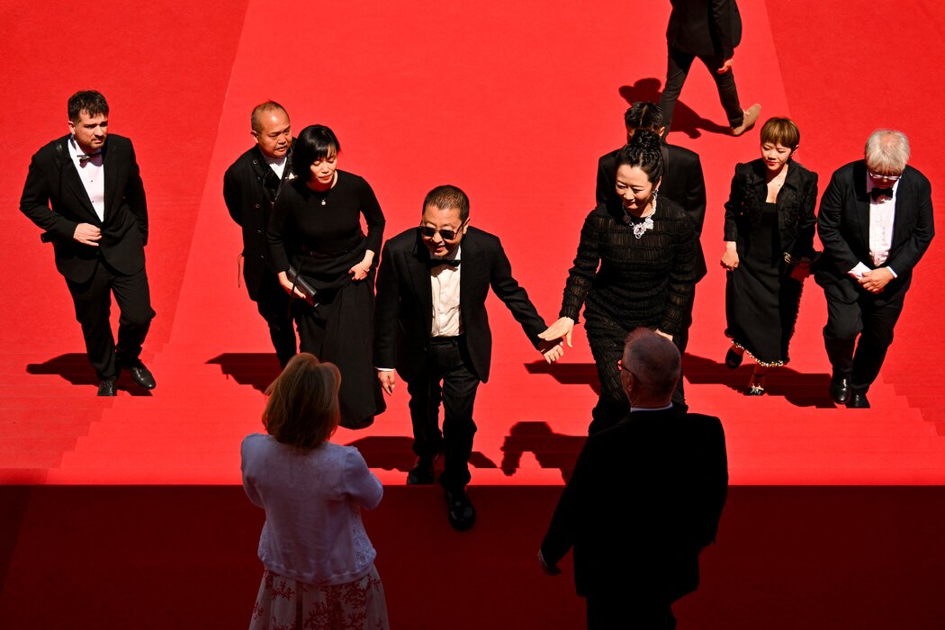 贾樟柯(中)在2024年法国戛纳电影节上。 ANTONIN THUILLIER/AGENCE FRANCE-PRESSE — GETTY IMAGES