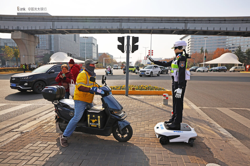 在中国中部城市芜湖,警方使用机器人协助交通监测。在中国,人工智能似乎无处不在。 WANG YUSHI/VCG, VIA GETTY IMAGES