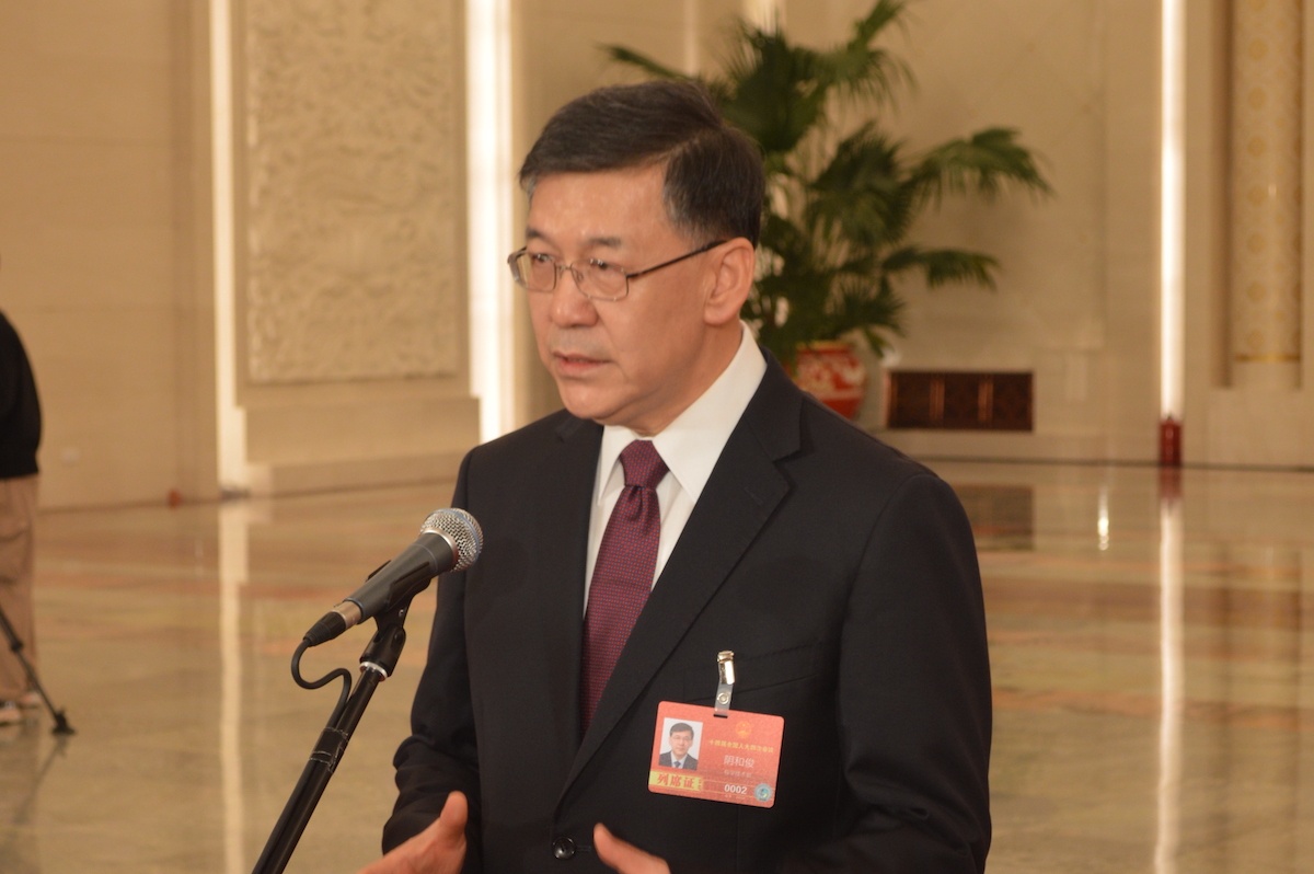 阴和俊在首场部长通道上答记者问。赵广立 摄