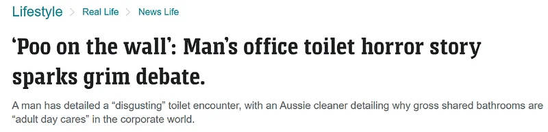 近日,23岁的悉尼小哥Harry Catanzariti就分享了自己在前公司的公共厕所遇到的糟糕经历。