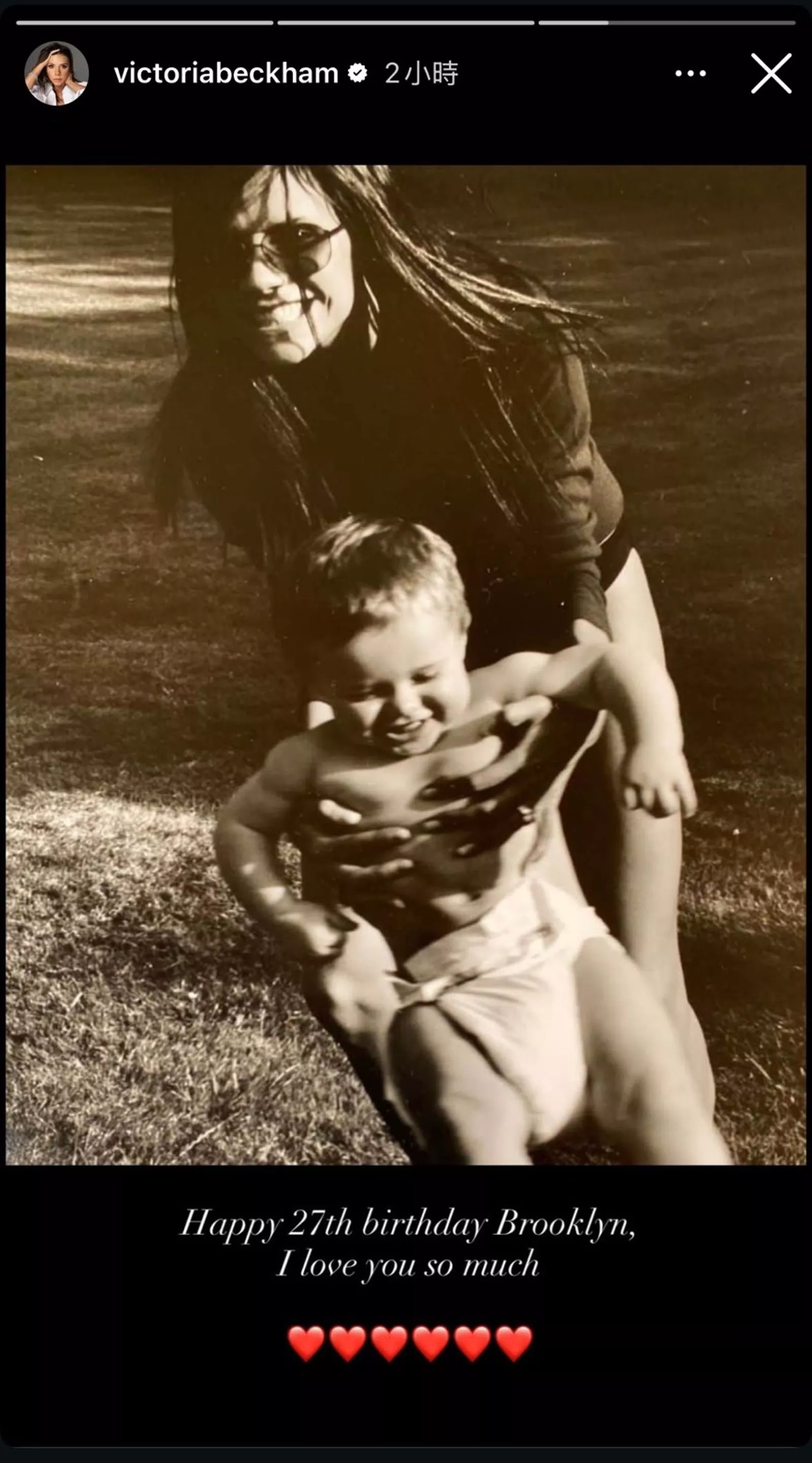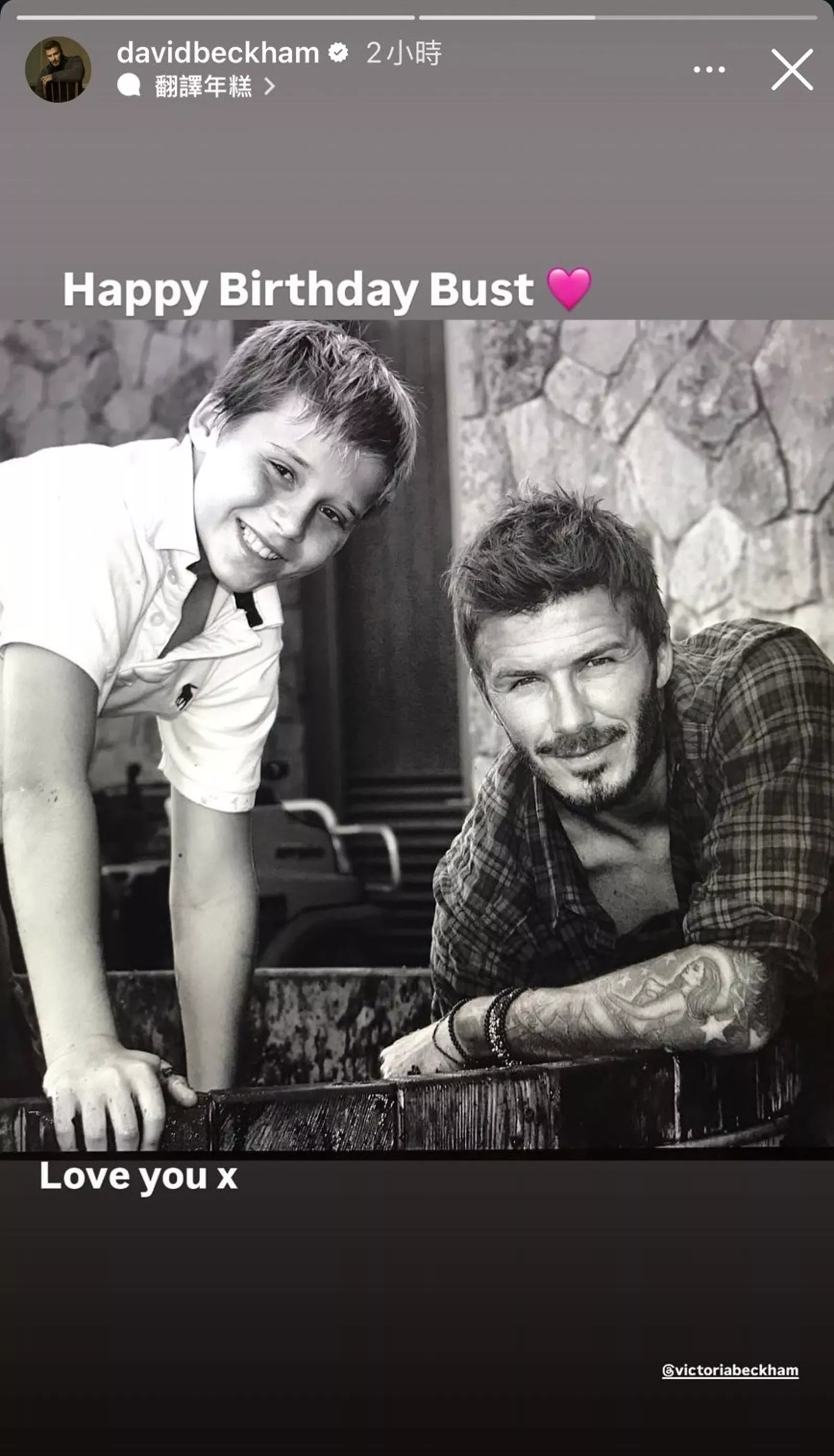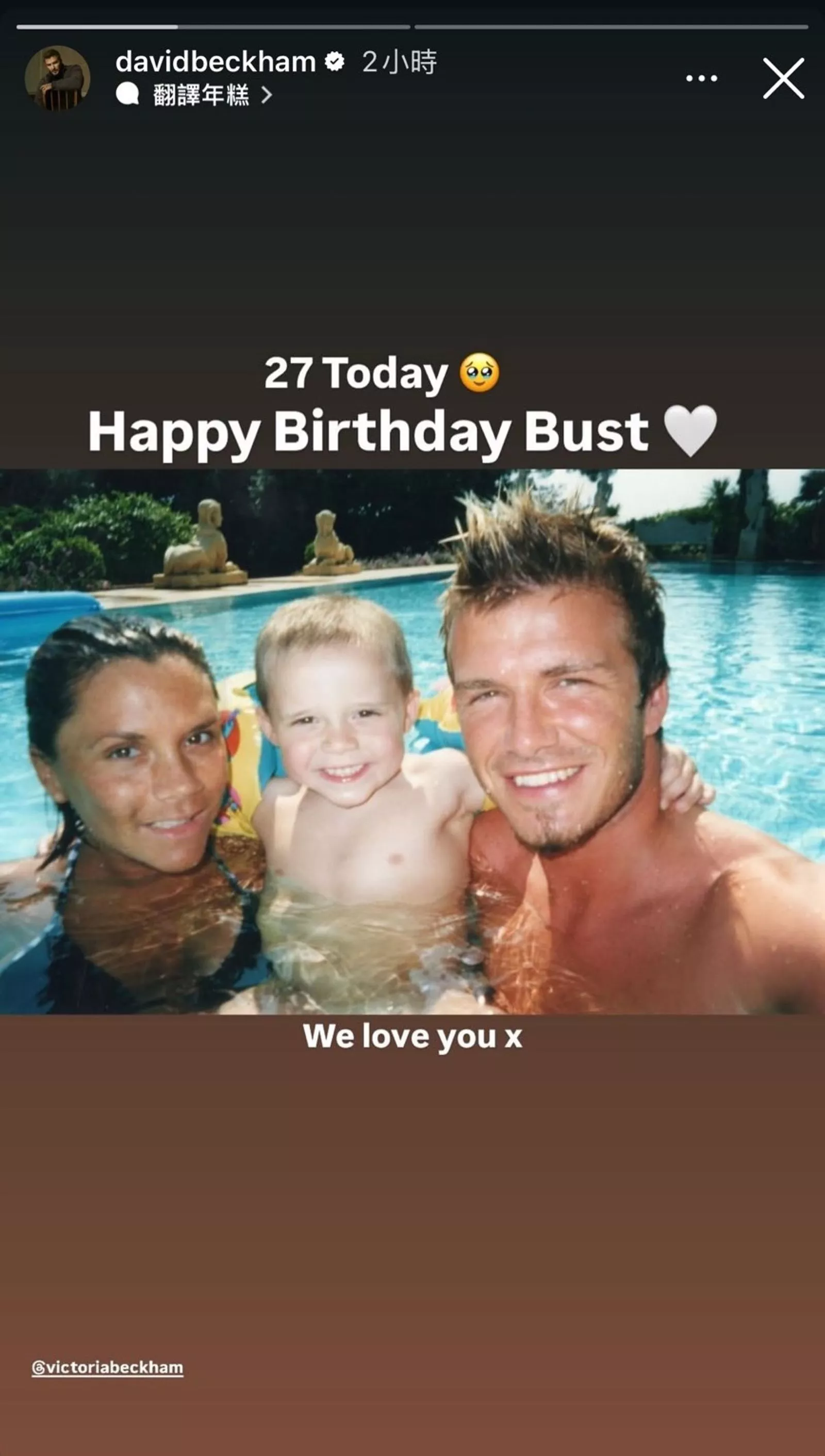 布鲁克林迎来27岁生日,贝克汉在IG限动分享儿子的童年旧照,还用他小时候的昵称「Buster」称呼他。贝克汉写下:「今天27岁了,生日快乐,Bust。我们爱你」。不久后,贝嫂也转发同一张照片,写道:「生日快乐布鲁克林,我们非常爱你」,随后再分享一张与儿子开怀大笑的童年旧照。