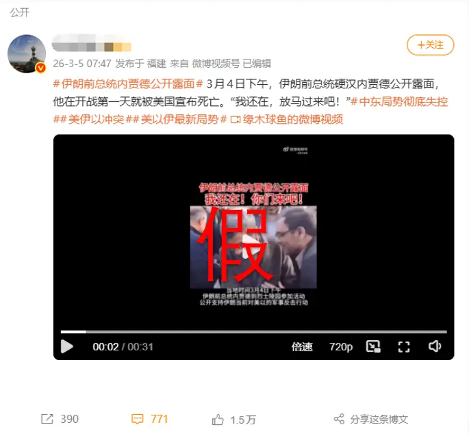 在2月28日美以对伊朗发动空袭并传出内贾德“身亡”传闻后,该旧视频被重新发布,并被贴上“3月4日现身辟谣”的标签,误导公众认为这是其最新的公开露面。