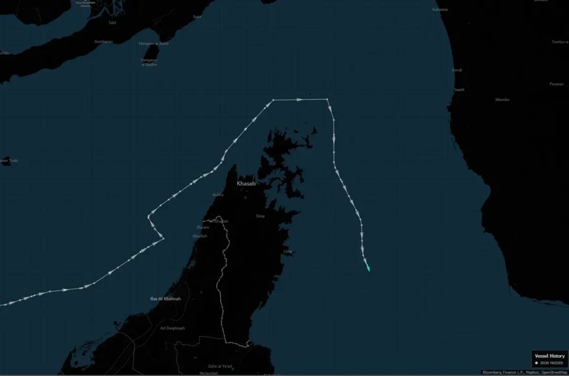 根据彭博社和Kpler的船舶跟踪数据,铁娘子号(Iron Maiden)于3月5日早些时候将其目的地信号从“For Orders”(待命)更改为“CHINA OWNER”(中国所有),并紧贴阿曼海岸线穿越该通道。Kpler数据显示,该船自去年12月以来一直在波斯湾运送多批货物。