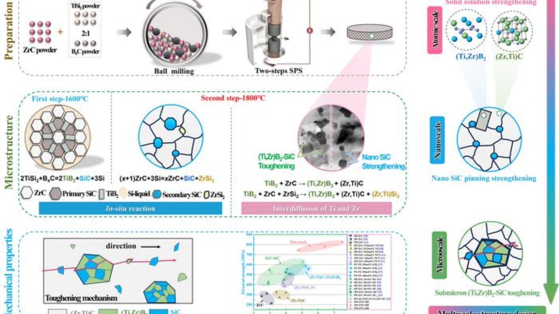 哈尔滨工业大学副教授魏博欣和研究员王玉瑾设计了一套两步原位反应火花等离子体烧结工艺(SPS),原料是碳化锆、二硅化钛(TiSi₂)和碳化硼(B₄C)。
