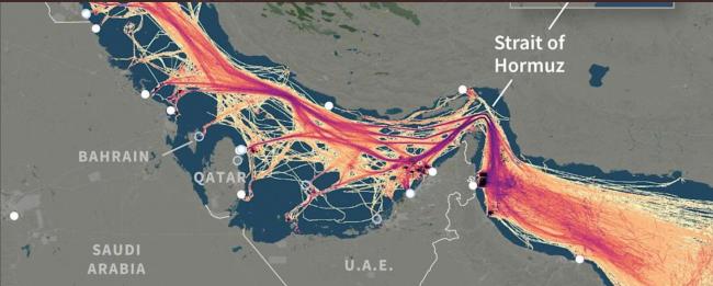 从航运地图上看,海峡南侧和波斯湾内部各有一团密集的船影,像两块停滞的血栓。