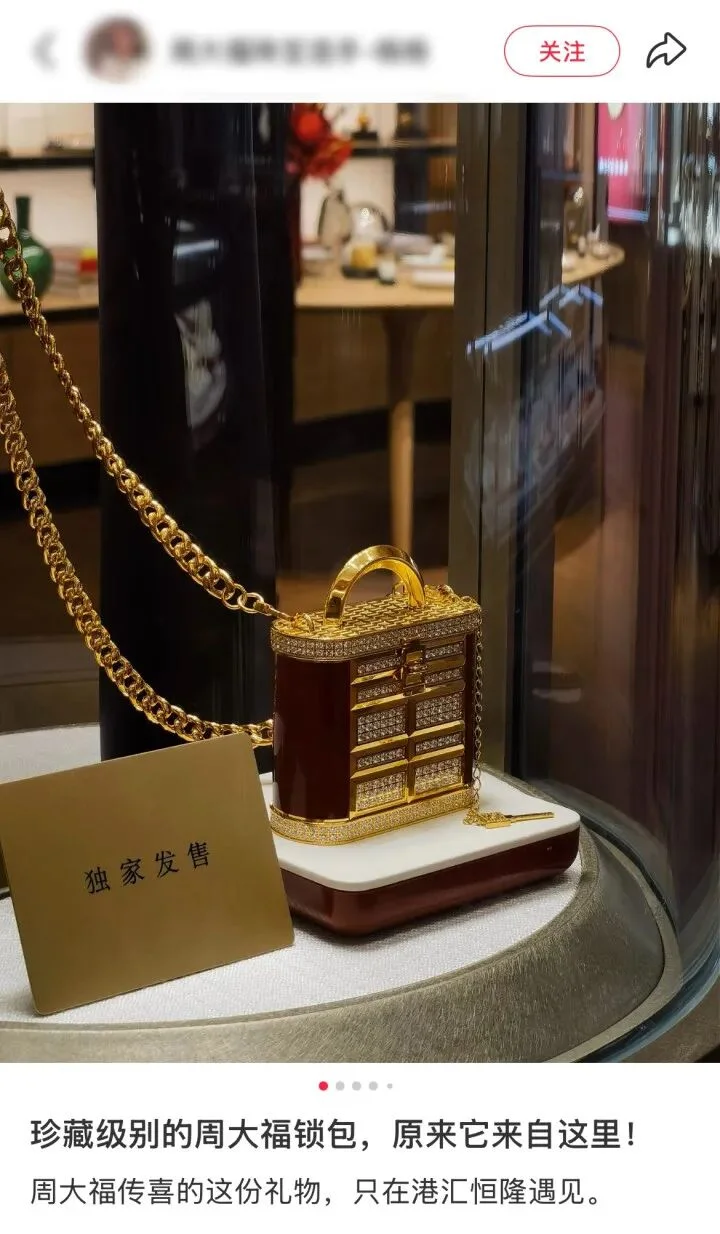 实际上早在1月8日,这款耳机盒就出现在上海港汇恒隆周大福Luxury店的展柜里,显示“独家发售”。当时柜姐晒出了耳机盒的实拍图,这是一个锁包形状的耳机盒,像传喜项链的一个放大版,尺寸是71mm×82mm,采用大面积镜面空窗红色鎏彩,并镶嵌了大量钻石,像一款斜挎包一样背在身上。