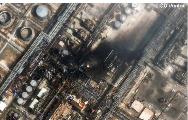 2026年3月2日,沙特阿拉伯拉斯塔努拉(Ras Tanura),卫星图像显示,美国和以色列与伊朗持续开火之际,炼油厂遭无人机袭击后冒出浓烟。(Reuters)