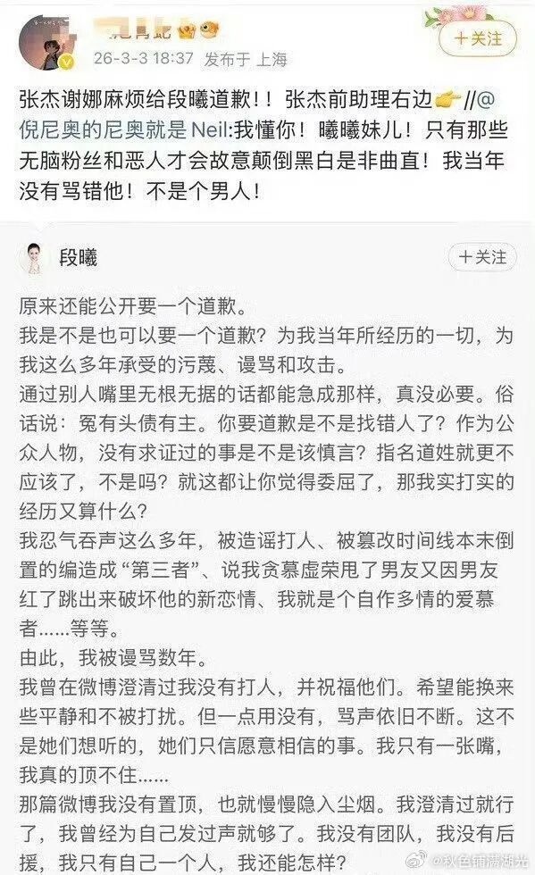 该网友账号为“倪尼奥的尼奥就是neil”,在段曦发布千字长文控诉张杰出轨、遭多年网暴后,他第一时间转发声援,措辞激烈地指责张杰人品堪忧,强调“当年没有骂错他”,还痛批粉丝“颠倒黑白”。