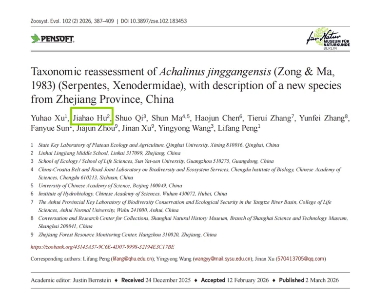 “人生第一篇SCI……这大概是17岁这年最珍贵的礼物!”3月3日晚间,浙江临海高三学生胡家豪在朋友圈晒出了国际期刊《Zoosystematics and Evolution》新鲜出炉的一篇论文截图,论文内容是浙江临海发现的爬行动物新物种——括苍山脊蛇。