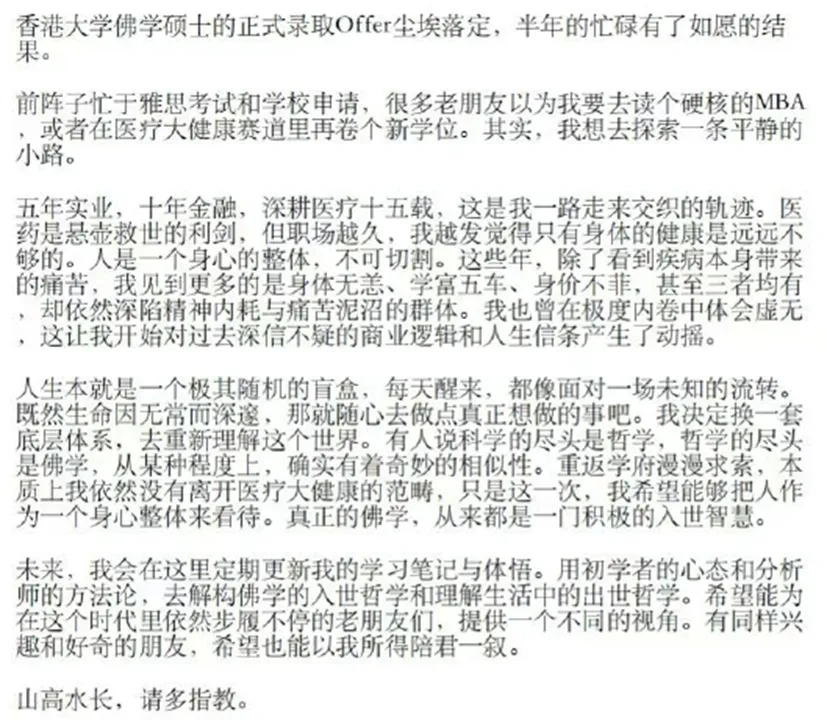 她公开辞职后的动向:前往香港大学攻读佛学硕士。