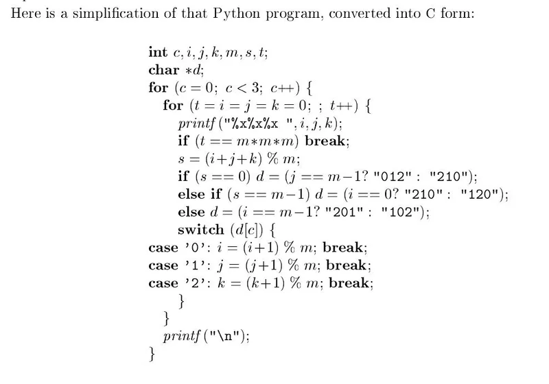 高德纳随后亲自将该程序简化为C语言版本,并验证m=3, 5, 7, 9, 11等情况,结果全部正确。