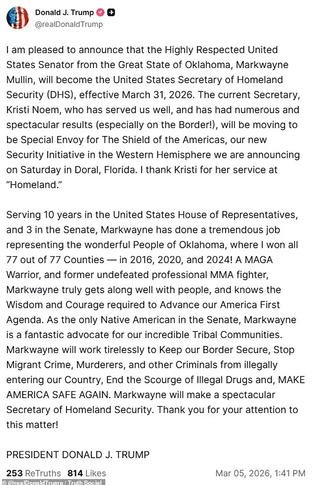川普随后在其社交平台Truth Social上宣布,他已决定提名俄克拉荷马州共和党参议员马克韦恩·穆林出任下一任国土安全部长,任命将于2026年3月31日生效。