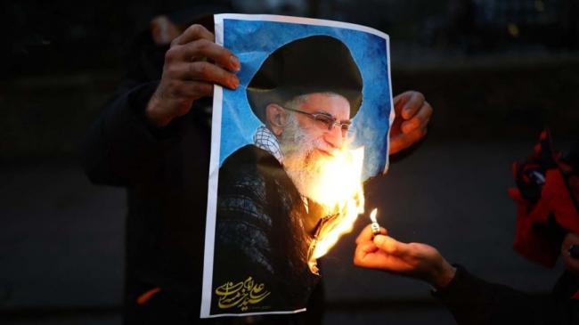 2026年1月12日,伊朗抗议民众焚烧伊斯兰极权领导人哈梅内伊的画像。(Henry NICHOLLS / AFP via Getty Images)