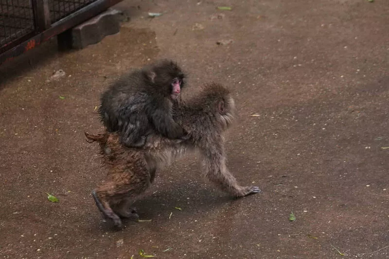 孤儿猕猴“Punch”3日和猴群互动,爬到一只猴朋友背上。(美联社)
