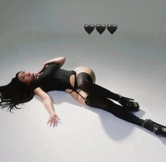 照片中,福克斯仅穿着一件黑色T恤和同色丁字裤坐在地板上。接下来的照片让粉丝们更清楚地看到了她的完整造型,包括黑色项圈、及膝长袜和厚底高跟鞋。福克斯还分享了另外两张同造型的照片,以及一段拍摄花絮。