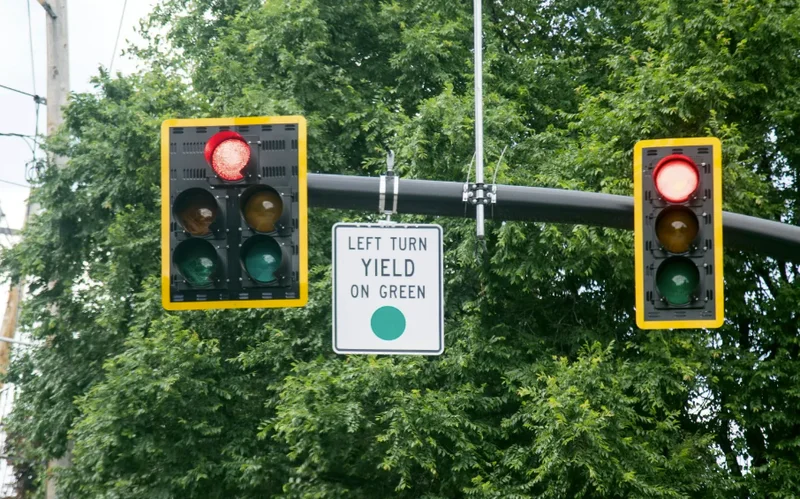 左转时绿灯闪烁的交通标志常常出现在许多繁忙的交叉口,提醒司机们即使绿灯亮起,也必须确保安全后再继续行驶。
