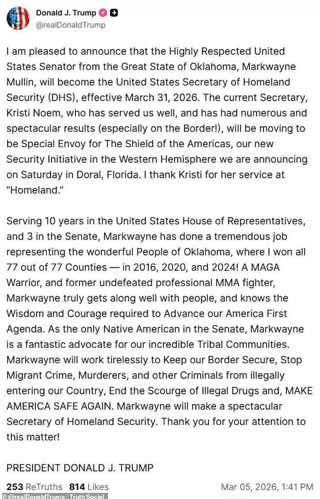 川普随后在其社交平台Truth Social上宣布,他已决定提名俄克拉荷马州共和党参议员马克韦恩·穆林出任下一任国土安全部长,任命将于2026年3月31日生效。